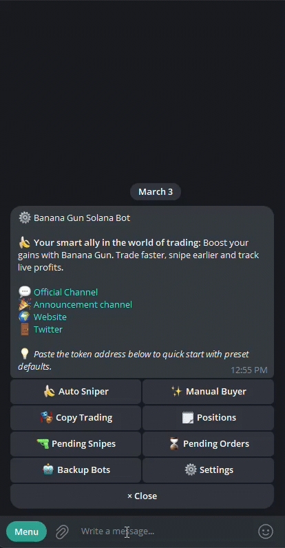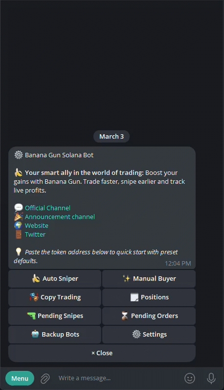 Select the Auto Sniper button in start menu or paste a token contract address that isn't live yet. This will open the auto snipe menu.