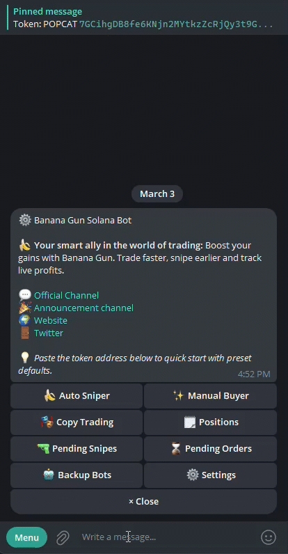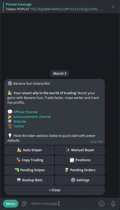 Paste the token's contract address (CA) or URL (e.g., Defined) to open the sell menu.