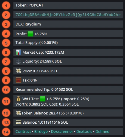 Links: Quick access to Solscan, Birdeye, Dexscreener, Dextools, and Defined.