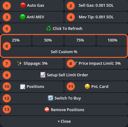 This menu appears after selecting your position or clicking "Switch to Sell" in the buy menu. It displays token information and sell settings.&#x20;
