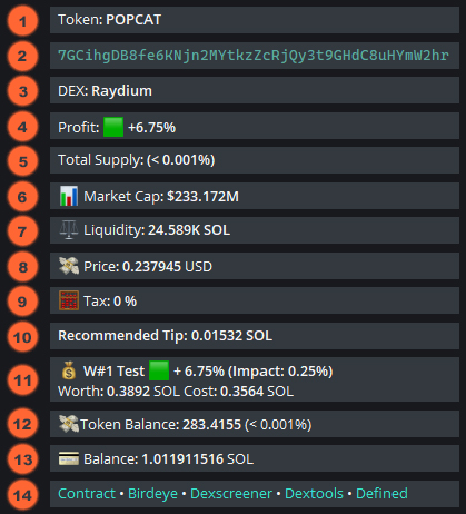 14. **Links:** Quick access to Solscan, Birdeye, Dexscreener, Dextools, and Defined.